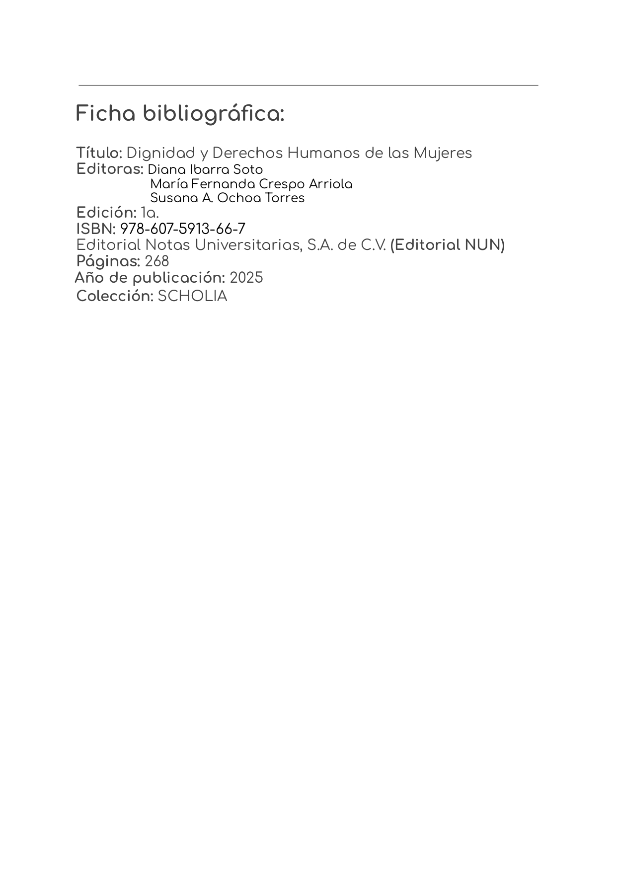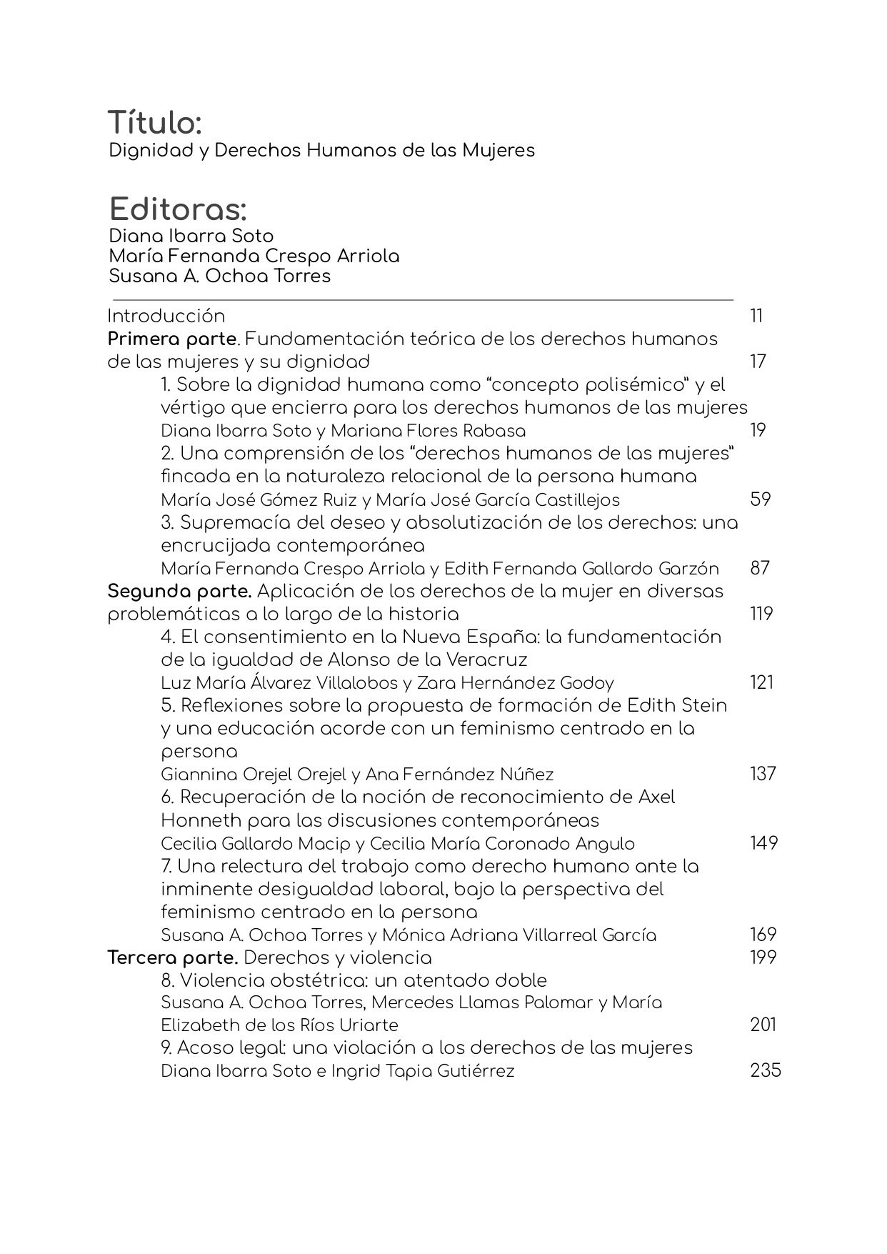 La obra se divide en tres partes. La primera aborda la fundamentación teórica de los derechos de las mujeres, con temas como la dignidad, la persona como realidad relacional y la vinculación entre deseos y derechos. La segunda parte coloca la discusión en diversas problemáticas que van desde su concepción histórica en el siglo xvi, pasando por un análisis antropológico-pedagógico y una propuesta de reconocimiento para subsanar desigualdades, hasta los retos que enfrentan las mujeres para lograr la armonización laboral.