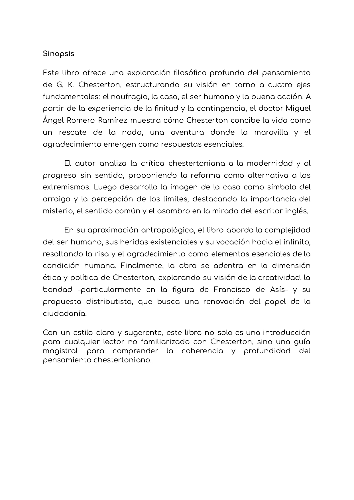 En su aproximación antropológica, el libro aborda la complejidad del ser humano, sus heridas existenciales y su vocación hacia el infinito, resaltando la risa y el agradecimiento como elementos esenciales de la condición humana. Finalmente, la obra se adentra en la dimensión ética y política de Chesterton, explorando su visión de la creatividad, la bondad –particularmente en la figura de Francisco de Asís– y su propuesta distributista, que busca una renovación del papel de la ciudadanía.Con un estilo claro y sugerente, este libro no solo es una introducción para cualquier lector no familiarizado con Chesterton, sino una guía magistral para comprender la coherencia y profundidad del pensamiento chestertoniano.