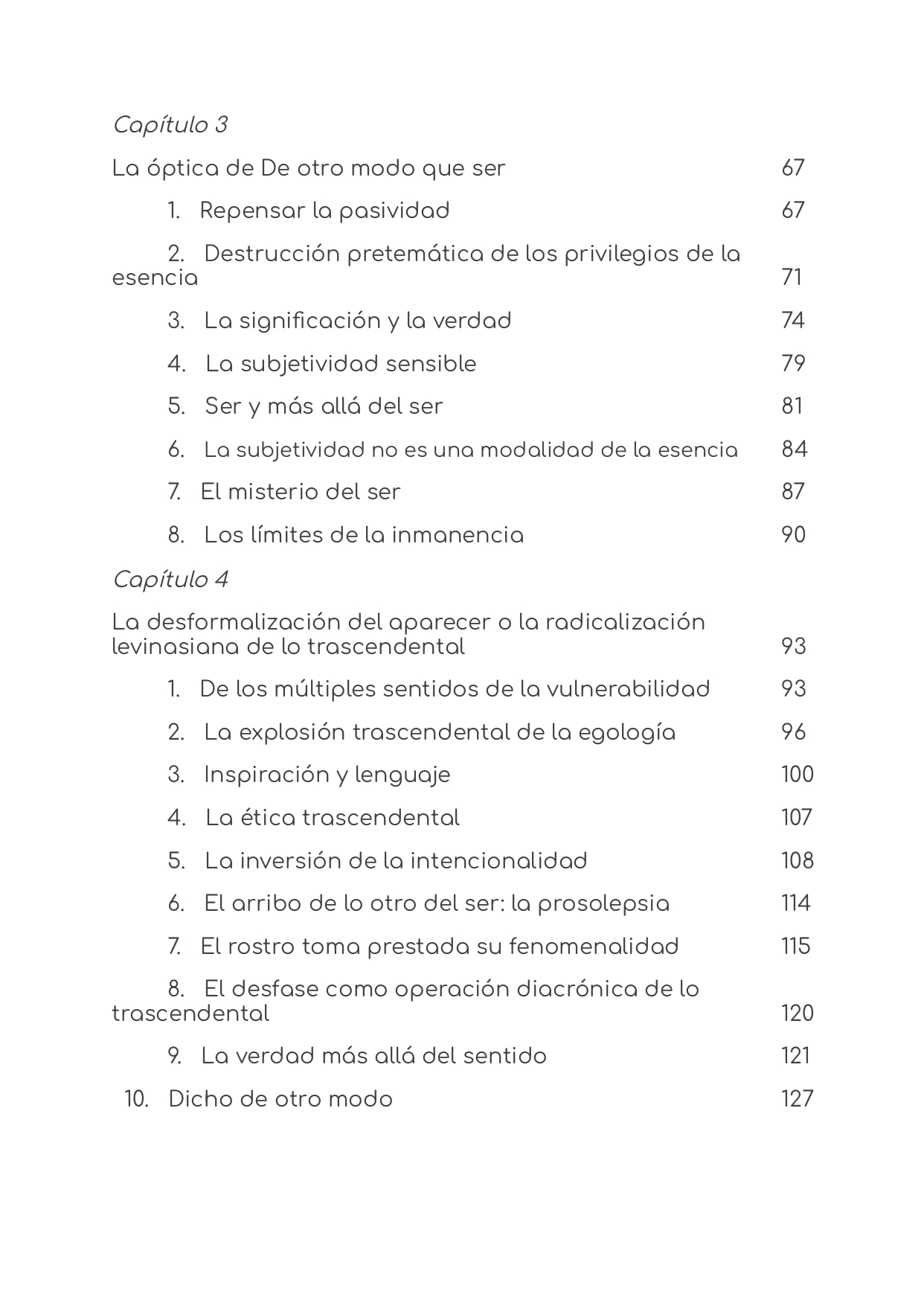 Este libro, de inspiración levinasiana, es un ajuste de cuentas con Heidegger y, paralelamente, con la historia de la filosofía. Describe las diferentes estrategias utilizadas por Levinas para encontrar un desajuste en la subjetividad capaz de infiltrar en el ser la paz y la justicia. Si el pensamiento ontoteológico se había disputado el ser a partir del ente, consumándose en la era de la destrucción atómica del mundo, dispuesta por el ser humano como su dominador, el pensamiento levinasiano toma lo no visto por aquel como la esperanza para que un nuevo modo de plantear el ser sea posible. Esta es la función que desempeña el otro modo que ser en la obra madura de Levinas. La idea que la diacronía debe mantener el estatus de excedencia del Decir sobre lo Dicho es una tesis que traspasa por completo este trabajo. Gracias a ella podremos asistir al impresionante pensar de Emmanuel Levinas como un desarrollo dispuesto a hacer explotar la inmanencia egoísta de la ontología. Sus diversos ingresos al núcleo del filosofar exigen una fenomenología de lo invisible capaz de expresar los límites de la filosofía. Su propuesta consiste en avanzar a través de la vulneración del yo y mediante acontecimientos nocturnos a las potencias de lo que la filosofía había considerado inferior desde su inicio. Es así que se invierten todos los términos y se descubre una pasividad de una excelencia tal que supera toda receptividad: una pasividad tan pasiva que actúa sin actuar.